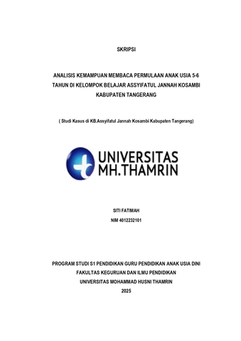 Siti, Fatimah (2025) Analisis Kemampuan Membaca Permulaan Anak Usia 5 - 6 Tahun di Kelompok Belajar Assyifatul Jannah Kosambi Kabupaten Tangerang. Other thesis, Universitas Mohammad Husni Thamrin.