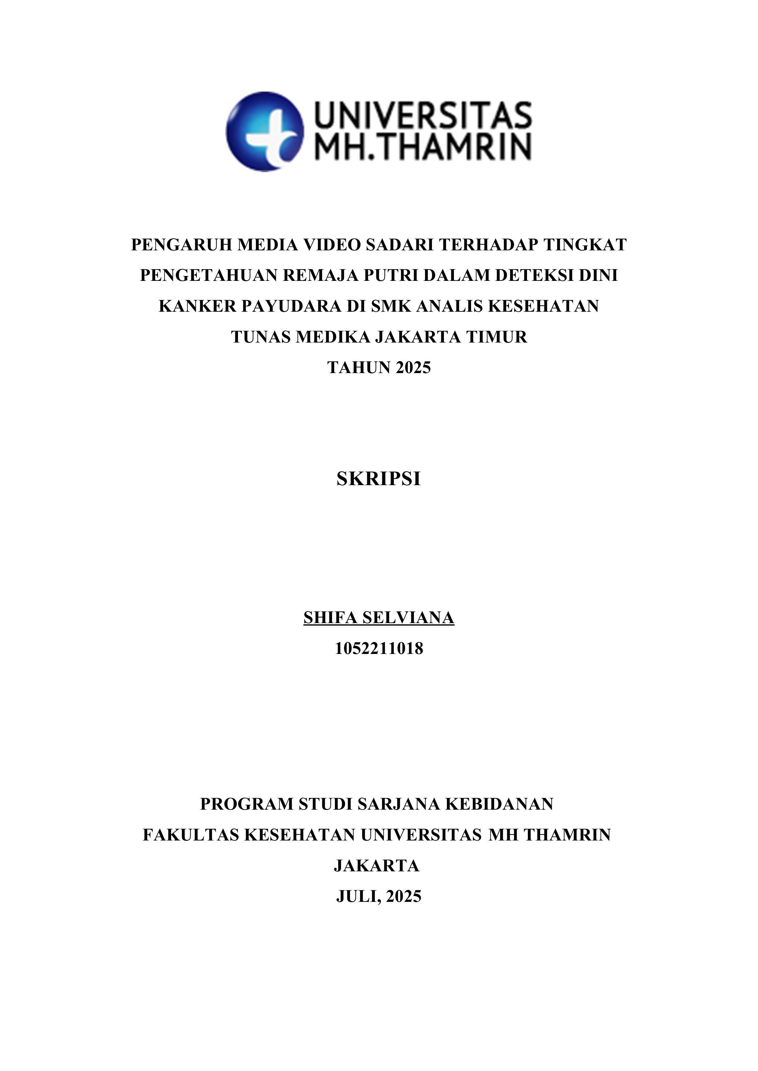 Shifa, Selviana (2025) Pengaruh Media Video SADARI terhadap Tingkat Pengetahuan Remaja Putri dalam Deteksi Dini Kanker Payudara di SMK Analis Kesehatan Tunas Medika Jakarta Timur Tahun 2025. Other thesis, Universitas Mohammad Husni Thamrin.