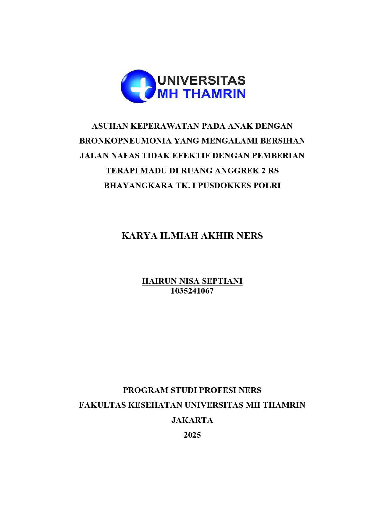 Hairun, Nisa Septiani (2025) Asuhan Keperawatan pada Anak dengan Bronkopneumonia yang Mengalami Bersihan Jalan Napas tidak Efektif dengan Pemberian Terapi Madu di Ruang Anggrek 2 RS Bhayangkara Tk I Pusdokkes Polri. Other thesis, Universitas Mohamad Husni Thamrin.
