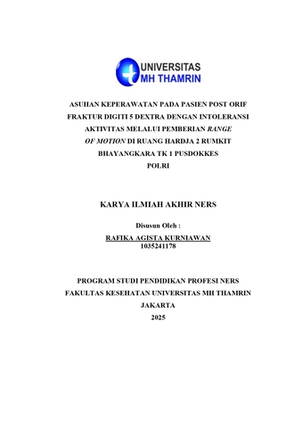 Rafika, Agista Kurniawan (2025) Asuhan Keperawatan pada Pasien Post Orif Fraktur Digiti 5 Dextra dengan Intoleransi Aktivitas Melalui Pemberian Range of Motion di Ruang Hardja 2 Rumkit Bhayangkara TK I Pusdokkes POLRI. Other thesis, Universitas Mohammad Husni Thamrin.