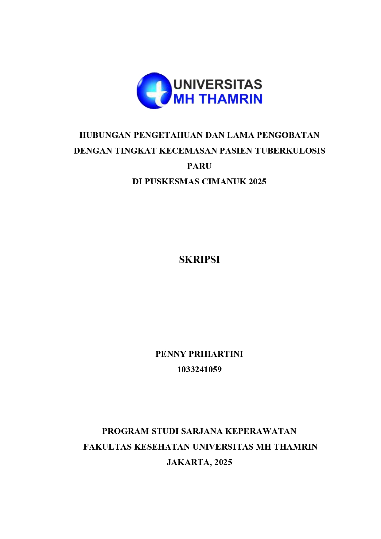 Penny, Prihatini (2025) Hubungan Pengetahuan dan Lama Pengobatan dengan Tingkat Kecemasan Pasien Tuberkulosis Paru di Puskesmas Cimanuk 2025. Other thesis, Universitas Mohammad Husni Thamrin.