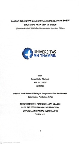 Agnes, Rulika Triwiyanti (2025) Dampak Kecanduan Gadget pada Perkembangan Sosial Emosional Anak Usia 5 - 6 Tahun (Penelitian Kualitatif di BKB PAUD Kuntum Melati Kelurahan Cililitan). Other thesis, Universitas Muhammad Husni Thamrin.