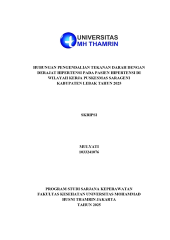 Mulyati, Mulyati (2025) Hubungan Pengendalian Tekanan Darah dengan Derajat Hipertensi pada Pasien Hipertensi di Wilayah Kerja Puskesmas Sarageni Kabupaten Lebak Tahun 2025. Other thesis, Universitas Mohammad Husni Thamrin.