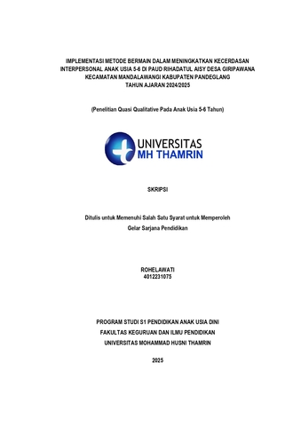 Rohelawati, Rohelawati (2025) Implementasi Metode Bermain dalam Meningkatkan Kecerdasan Interpersonal Anak Usia 5 - 6 di PAUD Rihadatul Aisy Desa Giripawana Kecamatan Mandalawangi Kabupaten Pandeglang Tahun Ajaran 2024/2025. Other thesis, Universitas Mohammad Husni Thamrin.