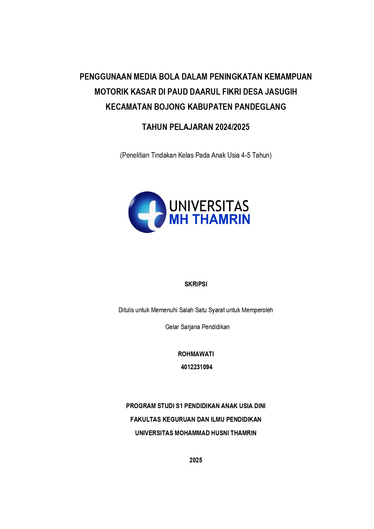 Rohmawati, Rohmawati (2025) Penggunaan Media Bola dalam Peningkatan Kemampuan Motorik Kasar di PAUD Daarul Fikri Desa Jasugih Kecamatan Bojong Kabupaten Pandeglang Tahun Pelajaran 2024/2025. Other thesis, Universitas Mohammad Husni Thamrin.