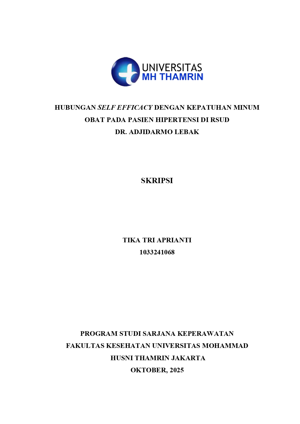 Tika, Tri Aprianti (2025) Hubungan Self Efficacy dengan Kepatuhan Minum Obat pada Pasien Hipertensi di RSUD dr. Adjidarmo Lebak. Other thesis, Universitas Mohammad Husni Thamrin.