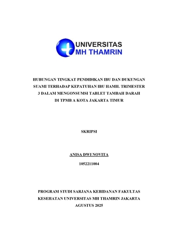 Anisa, Dwi Novita (2025) Hubungan Tingkat Pendidikan Ibu dan Dukungan Suami terhadap Kepatuhan Ibu Hamil Trimester 3 dalam Mengonsumsi Tablet Tambah Darah di TPMB A Kota Jakarta Timur. Other thesis, Universitas Muhammad Husni Thamrin.