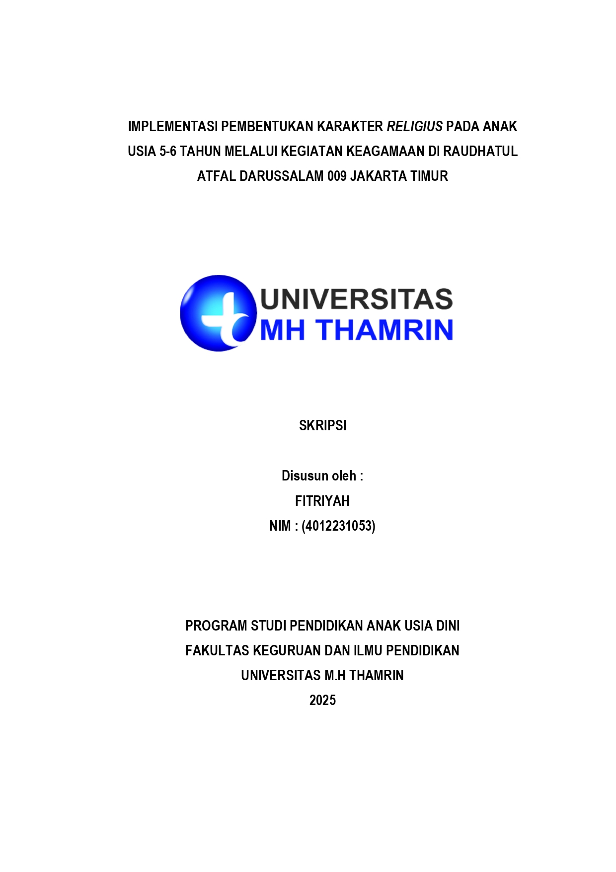 Fitriyah, Fitriyah (2025) Implementasi Pembentukan Karakter Religius pada Anak Usia 5 - 6 Tahun Melalui Kegiatan Keagamaan di Raudhatul Atfal Darussalam 009 Jakarta Timur. Other thesis, Universitas Mohammad Husni Thamrin.