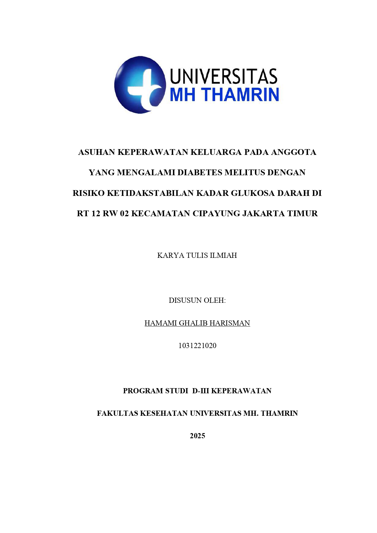 Hamami, Ghalib Harisman (2025) Asuhan Keperawatan Keluarga pada Anggota yang Mengalami Diabetes Melitus dengan Risiko Ketidakstabilan Kadar Glukosa Darah di RT 12 RW 02 Kecamatan Cipayung Jakarta Timur. Diploma thesis, Universitan Mohammad Husni Thamrin.