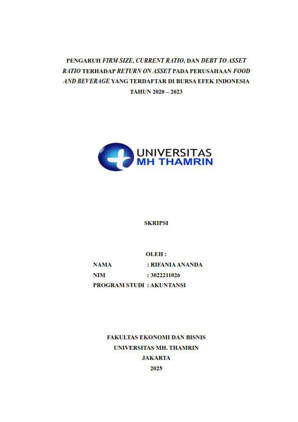 Rifania, Ananda (2025) Pengaruh Firm Size, Current Ratio, dan Debt to Asset Ratio terhadap Return on Asset pada Perusahaan Food and Beverage yang Terdaftar di Bursa Efek Indonesia Tahun 2020 - 2023. Other thesis, Universitas Mohammad Husni Thamrin.