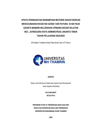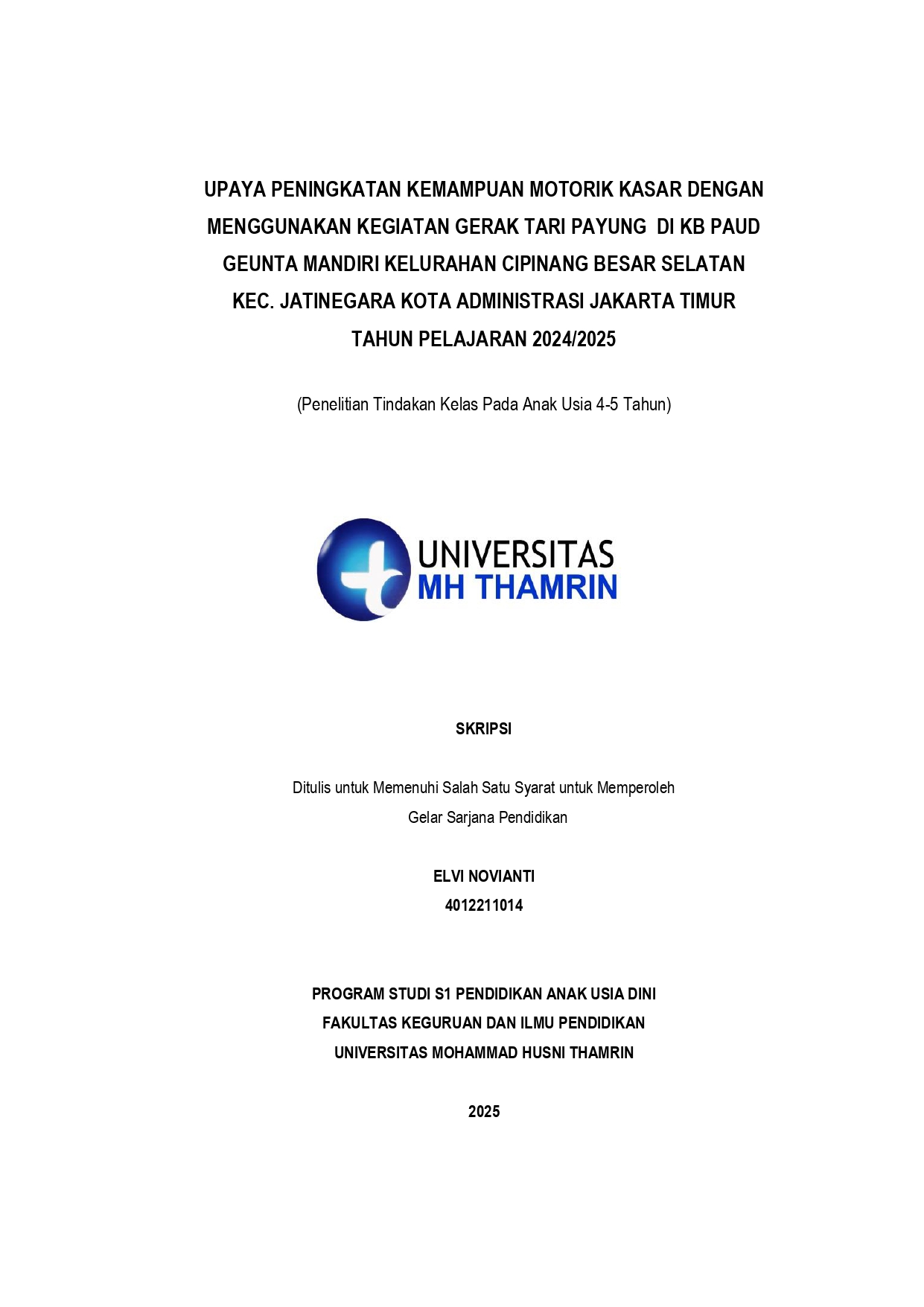 Elvi, Novianti (2025) Upaya Peningkatan Kemampuan Motorik Kasar dengan Menggunakan Kegiatan Gerak Tari Payung di KB PAUD Geunta Mandiri Kelurahan Cipinang Besar Selatan Kec. Jatinegara Kota Administrasi Jakarta Timur Tahun Pelajaran 2024/2025. Other thesis, Universitas Mohammad Husni Thamrin.