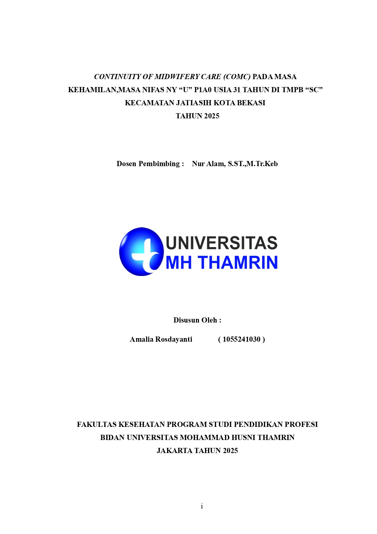 Amalia, Rosdayanti (2025) Continuity of Midwifery Care (COMC) pada Masa Kehamilan, Masa Nifas Ny “U” P1a0 Usia 31 Tahun di TMPB “Sc” Kecamatan Jatiasih Kota Bekasi Tahun 2025. Other thesis, Universitas Mohammad Husni Thamrin.