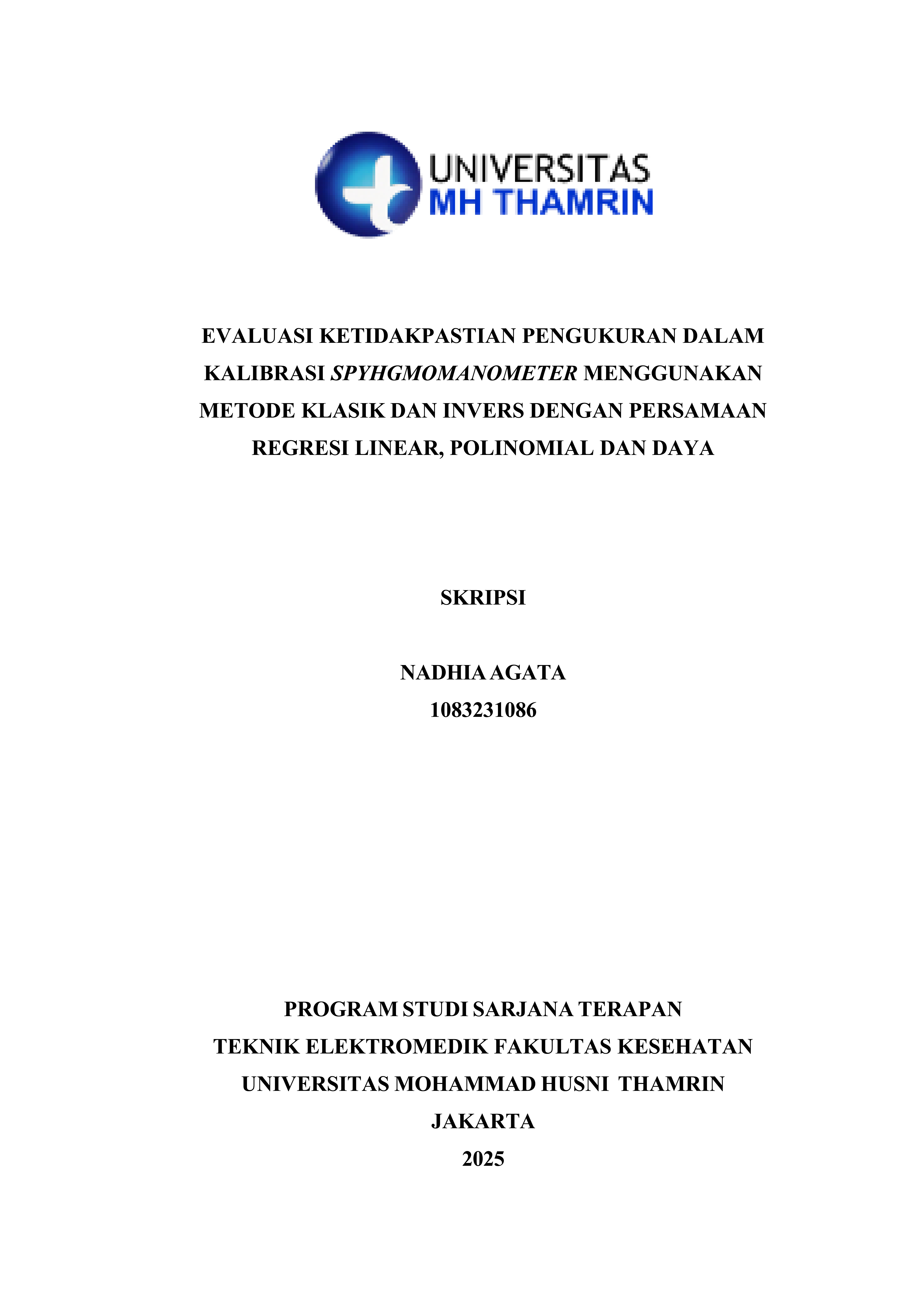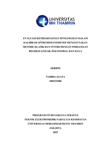 Nadhia, Agata (2025) Evaluasi Ketidakpastian Pengukuran dalam Kalibrasi Spyhgmomanometer Menggunakan Metode Klasik dan Invers dengan Persamaan Regresi Linear, Polinomial dan Daya. Diploma thesis, Universitas Mohammad Husni Thamrin.