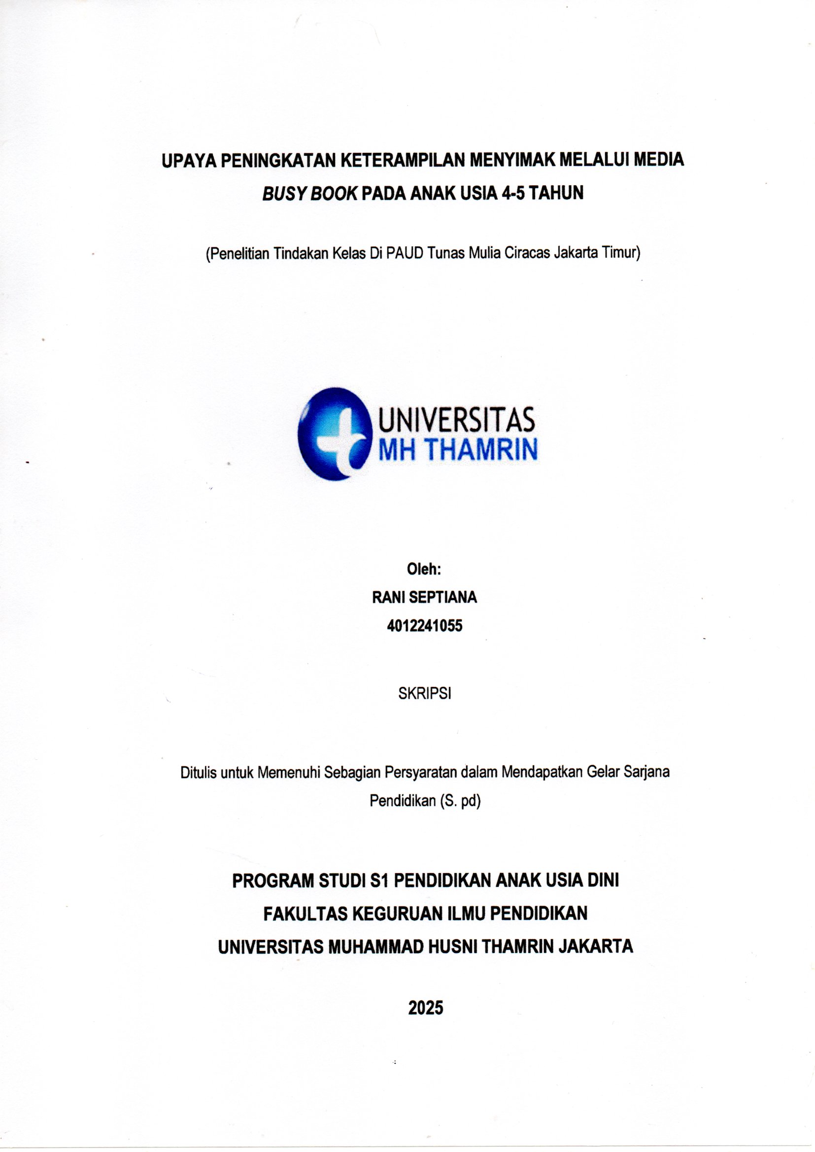 RAni, Septiana (2025) Upaya Peningkatan Keterampilan Menyimak Melalui Media Busy Book pada Anak Usia 4-5 Tahun. Other thesis, Universitas Mohammad Husni Thamrin.