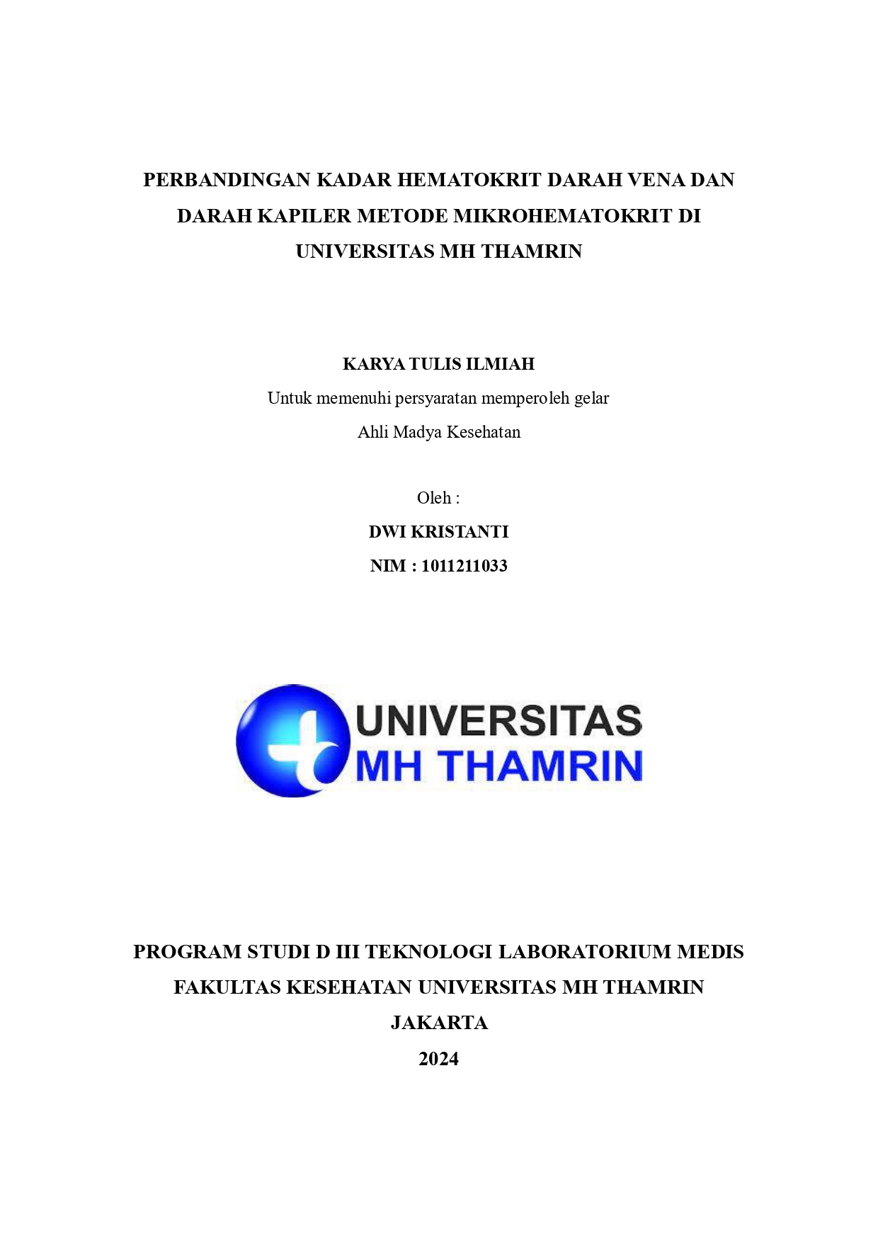 DWI, KRISTANTI (2024) PERBANDINGAN KADAR HEMATOKRIT DARAH VENA DAN DARAH KAPILER METODE MIKROHEMATOKRIT DI UNIVERSITAS MH THAMRIN. Diploma thesis, UNIVERSITAS MOHAMMAD HUSNI THAMRIN.