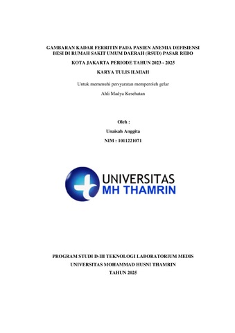 Unaisah, Anggita (2025) Gambaran Kadar Ferritin pada Pasien Anemia Defisiensi Besi di Rumah Sakit Umum Daerah (RSUD) Pasar Rebo Kota Jakarta Periode Tahun 2023 - 2025. Diploma thesis, Universitas Mohammad Husni Thamrin.