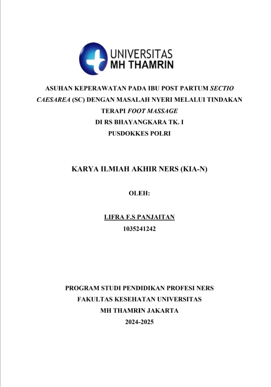 Lifra, F.S Panjaitan (2025) Asuhan Keperawatan Ibu Post Partum Sectio Caesarea (SC) dengan Masalah Nyeri Melalui Tindakan Terapi Foot Massage di Ruang Cempaka 2 RS Bhayangkara Tk. I Pusdokkes Polri. Other thesis, Universitas Mohammad Husni Thamrin.