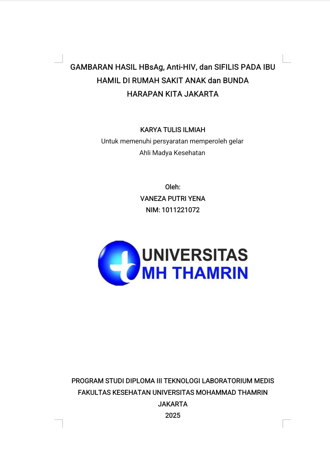 Vaneza Putri, Yena (2025) Gambaran Hasil Hbsag, Anti-HIV, dan Sifilis pada Ibu Hamil di Rumah Sakit Anak dan Bunda Harapan Kita Jakarta. Diploma thesis, Universitas Mohammad Husni Thamrin.