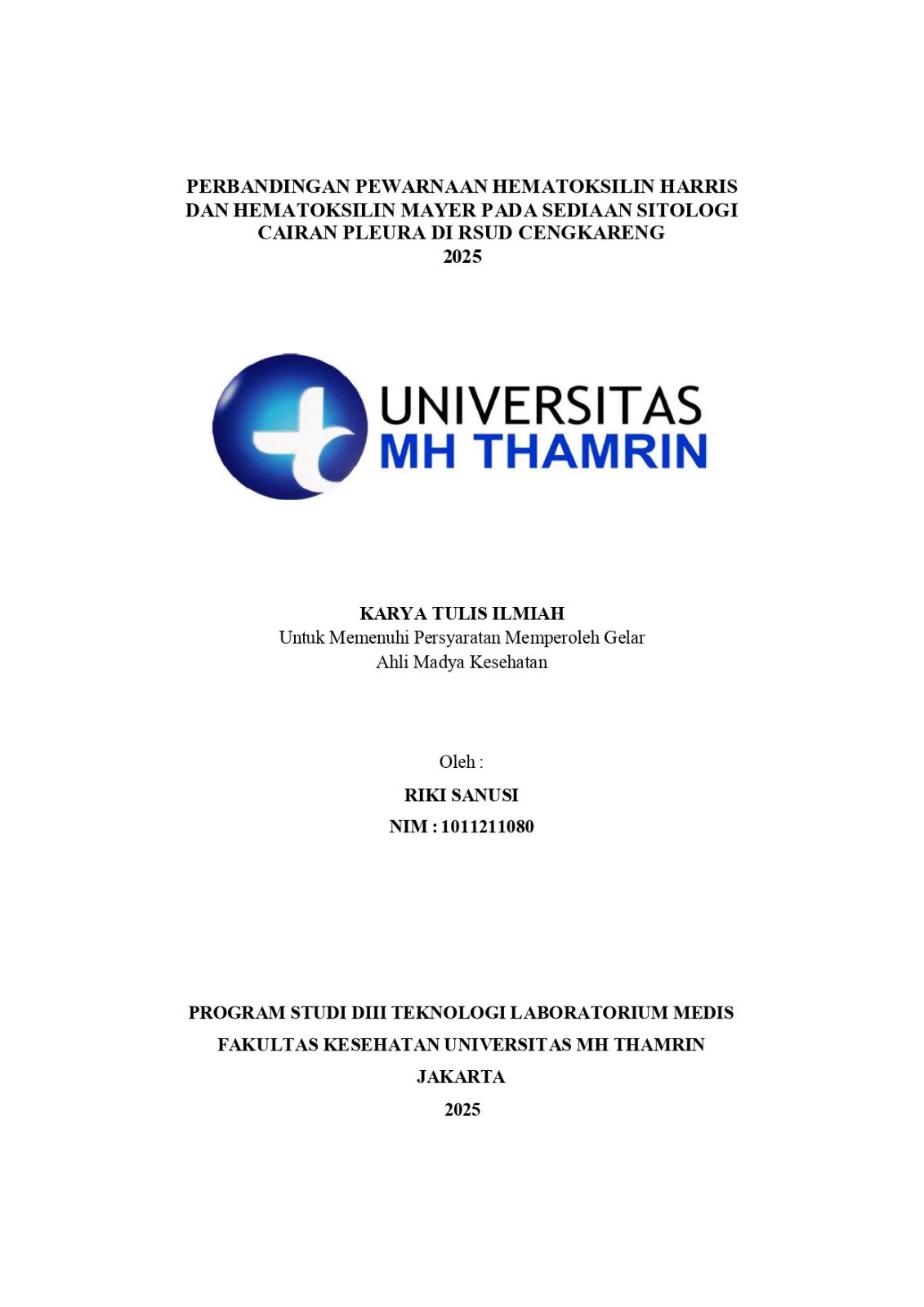 Riki, Sanusi (2025) Perbandingan Pewarnaan Hematoksilin Harris dan Hematoksilin Mayer pada Sediaan Sitologi Cairan Pleura di RSUD Cengkareng 2025. Diploma thesis, Universitas Muhammad Husni Thamrin.