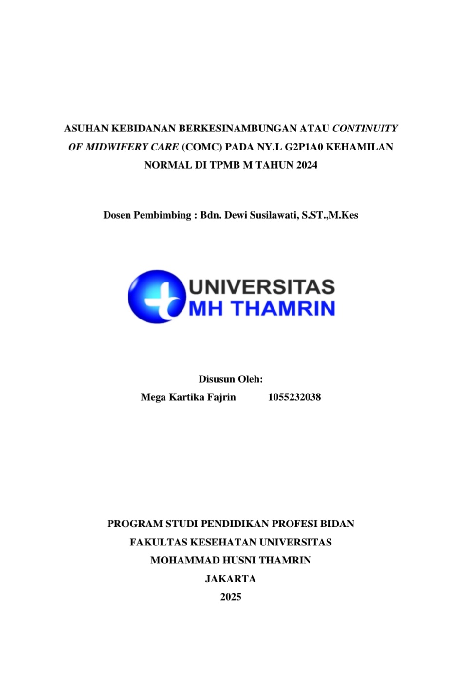 Mega, Kartika Fajrin (2025) Asuhan Kebidanan Berkesinambungan atau Continuity of Midwifery Care (COMC) pada Ny. L G2p1a0 Kehamilan Normal di TPMB M Tahun 2024. Other thesis, Universitas Mohammad Husni Thamrin.