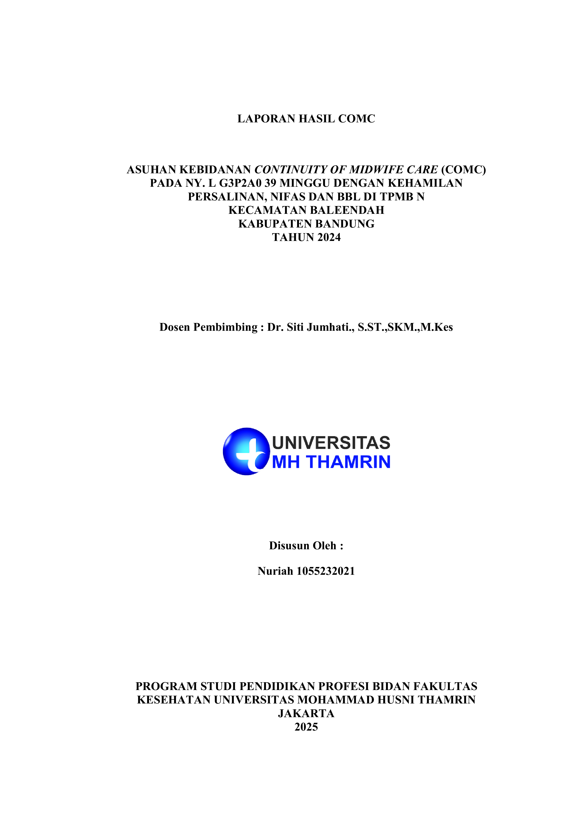 Nuriah, Nuriah (2025) Asuhan Kebidanan Continuity of Midwife Care (COMC) pada Ny. L G3P2A0 39 Minggu dengan Kehamilan Persalinan, Nifas dan BBL di TPMB N Kecamatan Baleendah Kabupaten Bandung Tahun 2024. Other thesis, Universitas Mohammad Husni Thamrin.