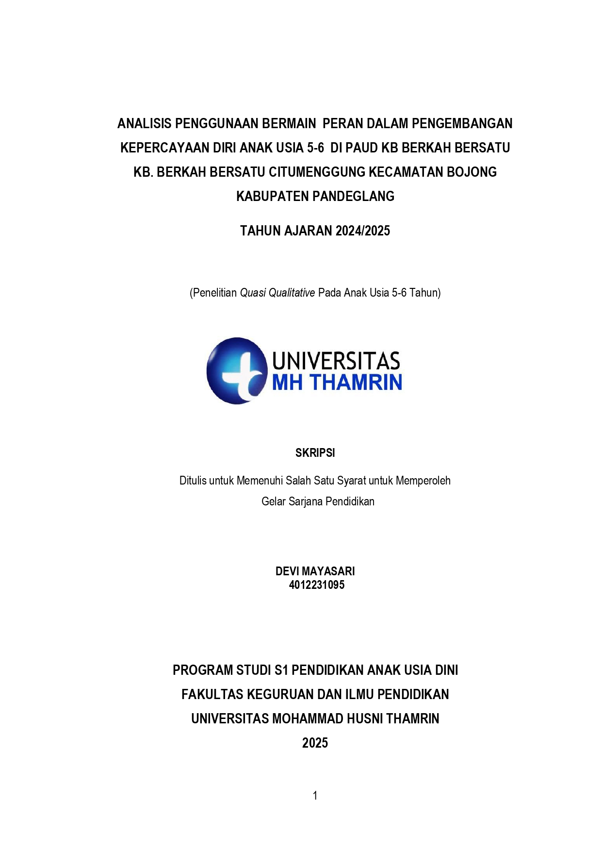 Devi, Mayasari (2025) Analisis Penggunaan Bermain Peran dalam Pengembangan Kepercayaan Diri Anak Usia 5-6 di PAUD KB Berkah Bersatu KB. Berkah Bersatu Citumenggung Kecamatan Bojong Kabupaten Pandeglang Tahun Ajaran 2024/2025. Other thesis, Universitas Mohammad Husni Thamrin.