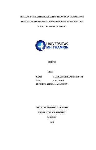 Lidya Marsyanda, Saputri (2024) PENGARUH CITRA MEREK, KUALITAS PELAYANAN DAN PROMOSI TERHADAP KEPUASAN PELANGGAN INDIHOME DI KECAMATAN CILILITAN JAKARTA TIMUR. Other thesis, Universitas Mohammad Husni Thamrin.