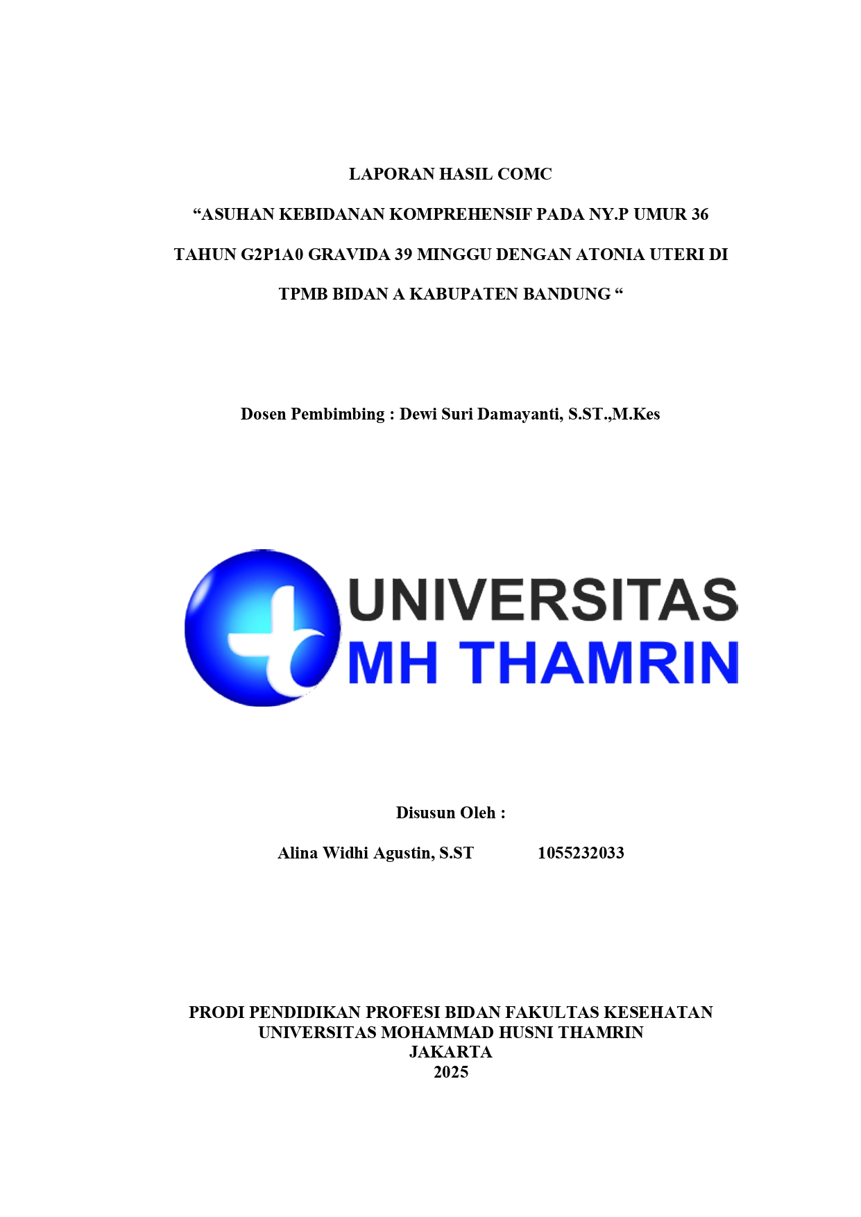 Alina, Widhi Agustin (2025) Laporan Hasil CoMC Asuhan Kebidanan Komprehensif pada Ny.P Umur 36 Tahun G2P1A0 Gravida 39 Minggu dengan Atonia Uteri di TPMB Bidan A Kabupaten Bandung. Diploma thesis, Universitas Mohammad Husni Thamrin.