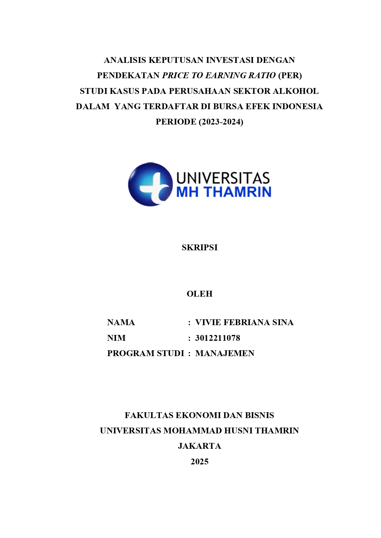 Vivie, Febriana Sina (2025) Analisis Keputusan Investasi dengan Pendekatan Price to Earning Ratio (PER) Studi Kasus pada Perusahaan Sektor Alkohol Dalam yang Terdaftar di Bursa Efek Indonesia Periode (2023-2024). Other thesis, Universitas Mohammad Husni Thamrin.