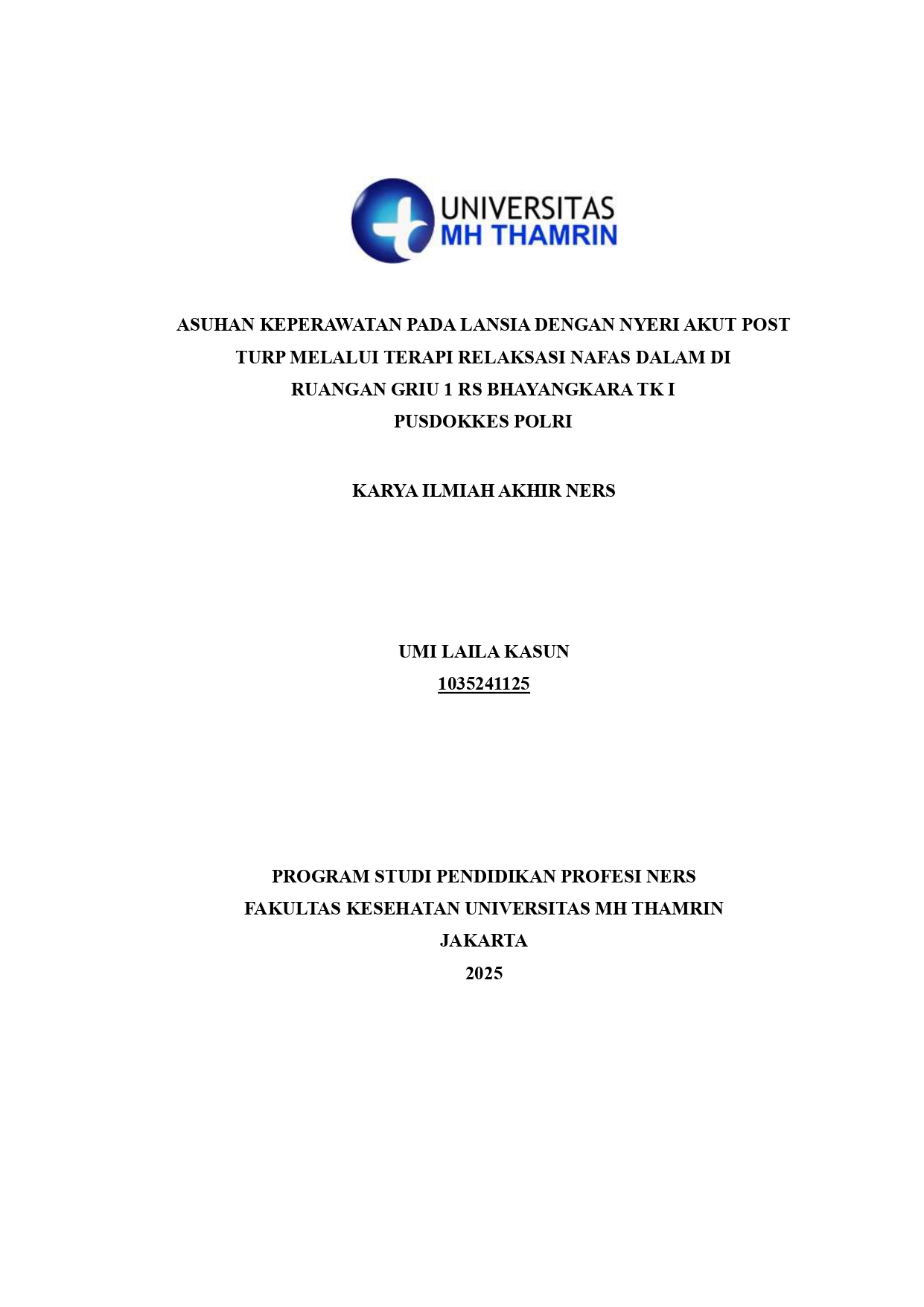 Umi Laila, Kasun (2025) Asuhan Keperawatan pada Lansia dengan Nyeri Akut Post Turp Melalui Terapi Relaksasi Nafas Dalam di Ruangan Griu 1 RS Bhayangkara Tk I Pusdokkes Polri. Other thesis, Universitas Mohammad Husni Thamrin.