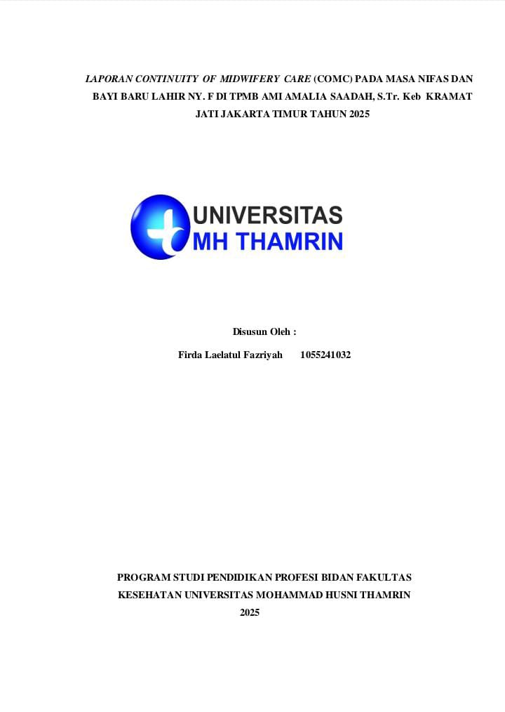 Firda, Laelatul Fazriyah (2025) Laporan Continuity of Midwifery Care (CoMC) pada Masa Nifas dan Bayi Baru Lahir Ny. F di TPMB Ami Amalia Saadah, S.Tr. Keb Kramat Jati Jakarta Timur Tahun 2025. Other thesis, Universitas Mohammad Husni Thamrin.