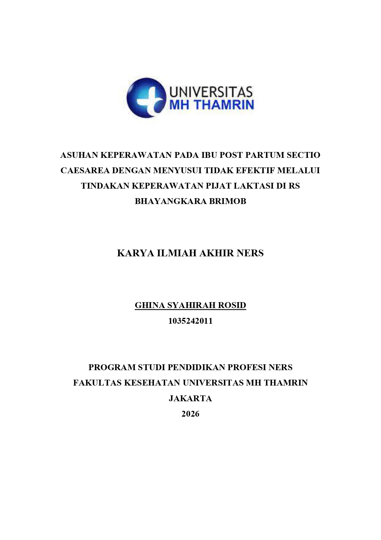 Ghina Syahirah, Rosid (2026) Asuhan Keperawatan pada Ibu Post Partum Sectio Caesarea dengan Menyusui Tidak Efektif Melalui Tindakan Keperawatan Pijat Laktasi di RS Bhayangkara Brimob. Other thesis, Universitas Mohammad Husni Thamrin.