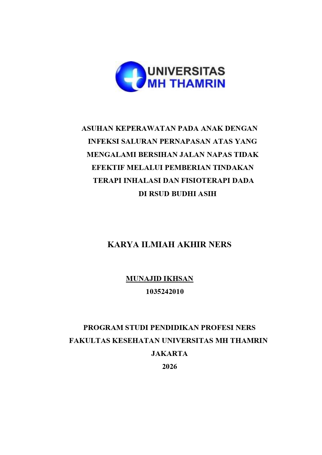 Munajid, Ikhsan (2026) Asuhan Keperawatan pada Anak dengan Infeksi Saluran Pernapasan Atas yang Mengalami Bersihan Jalan Napas Tidak Efektif Melalui Pemberian Tindakan Terapi Inhalasi dan Fisioterapi Dada di RSUD Budhi Asih. Other thesis, Universitas Mohammad Husni Thamrin.