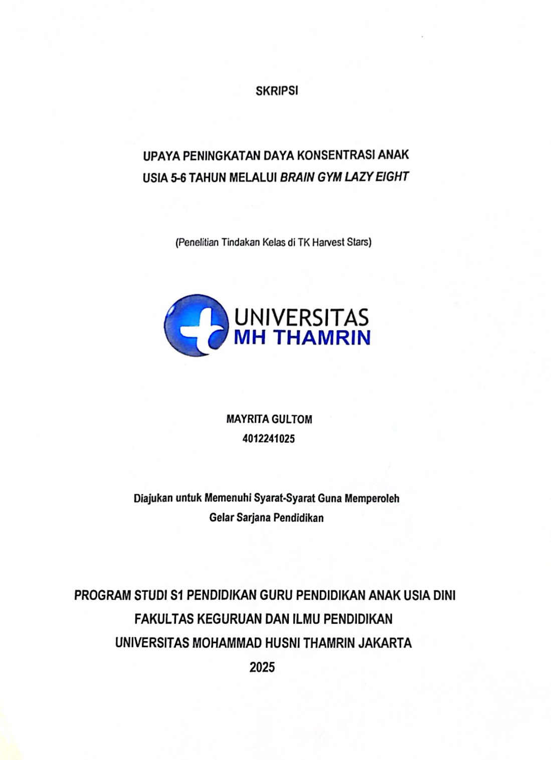 Mayrita, Gultom (2026) Upaya Peningkatan Daya Konsentrasi Anak Usia 5 -6 Tahun Melalui Brain Gym Lazy Eight. Other thesis, Universitas Mohammad Husni Thamrin.