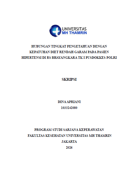 Dina, Apriani (2026) Hubungan Tingkat Pengetahuan Dengan Kepatuhan Diet Rendah Garam Pada Pasien Hipertensi di RS Bhayangkara Tk I Pusdokkes Polri. Other thesis, Universitas Mohammad Husni Thamrin.