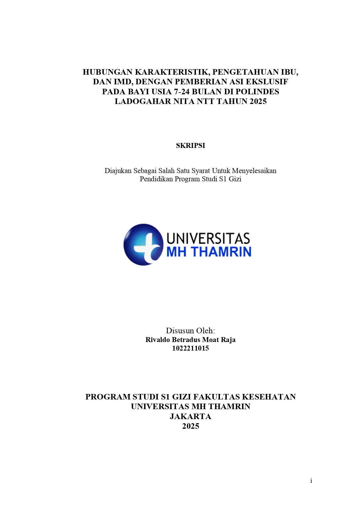 Rivaldo, Betradus Moat Raja (2025) Hubungan Karakteristik, Pengetahuan Gizi, dan IMD dengan Pemberian ASI Ekslusif pada Bayi Usia 7-24 Bulan di Polindes Ladogahar Kecamatan Nita Kabupaten Sikka Propinsi NTT Tahun 2024. Other thesis, Universitas Mohammad Husni Thamrin.