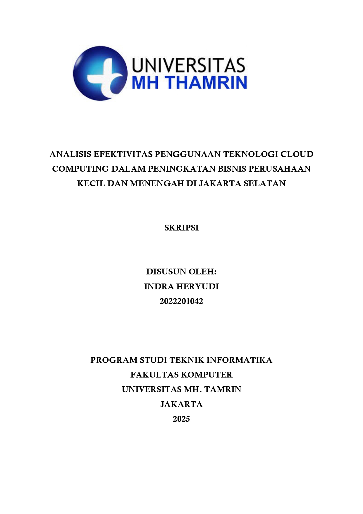 Indra, Heryudi (2025) Analisis Efektivitas Penggunaan Teknologi Cloud Computing dalam Peningkatan Bisnis Perusahaan Kecil dan Menengah di Jakarta Selatan. Other thesis, Universitas Mohammad Husni Thamrin.