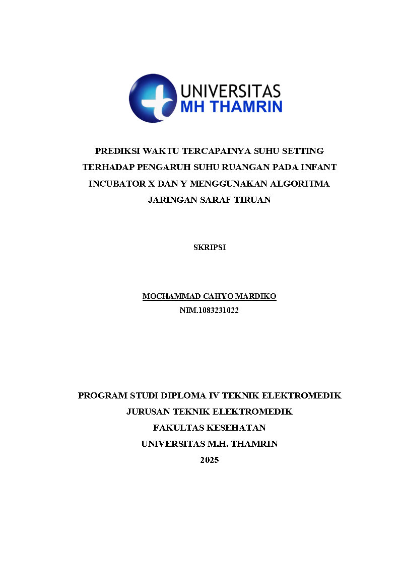 Mochammad Cahyo, Mardiko (2025) Prediksi Waktu Tercapainya Suhu Setting terhadap Pengaruh Suhu Ruangan pada Infant Incubator X dan Y Menggunakan Algoritma Jaringan Saraf Tiruan. Other thesis, Universitas Mohammad Husni Thamrin.