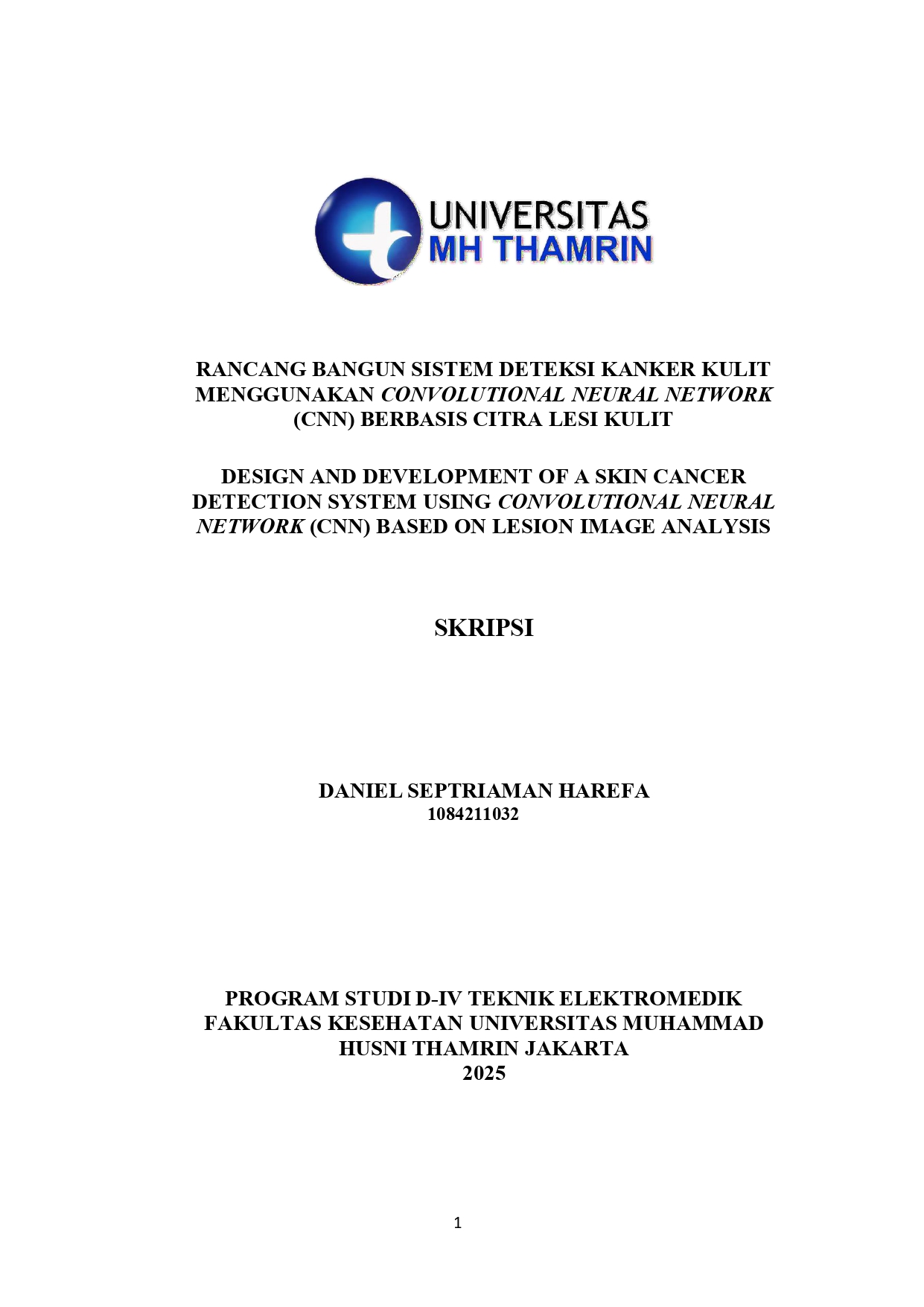 Daniel, Septriaman Harefa (2025) Rancang Bangun Sistem Deteksi Kanker Kulit Menggunakan Convolutional Neural Network (CNN) Berbasis Citra Lesi Kulit. Diploma thesis, Universitas Mohammad Husni Thamrin.