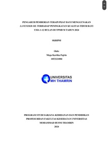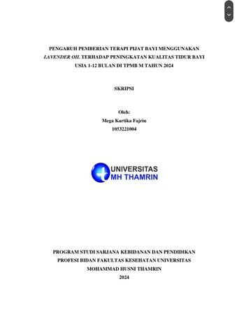 Mega Kartika, Fajrin (2024) PEMBERIAN TERAPI PIJAT BAYI MENGGUNAKAN LAVENDER OIL TERHADAP PENINGKATAN KUALITAS TIDUR BAYI USIA 1-12 BULAN DI TPMB M TAHUN 2024. Other thesis, Universitas Mohammad Husni Thamrin.