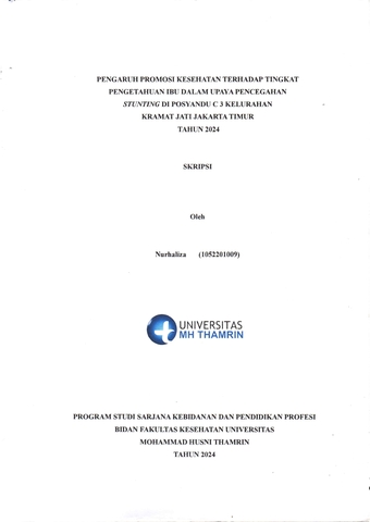 Nurhaliza, Nurhaliza (2024) PENGARUH PROMOSI KESEHATAN TERHADAP TINGKAT PENGETAHUAN IBU DALAM UPAYA PENCEGAHAN STUNTING DI POSYANDU C 3 KELURAHAN KRAMAT JATI JAKARTA TIMUR TAHUN 2024. Other thesis, Universitas Mohammad Husni Thamrin.