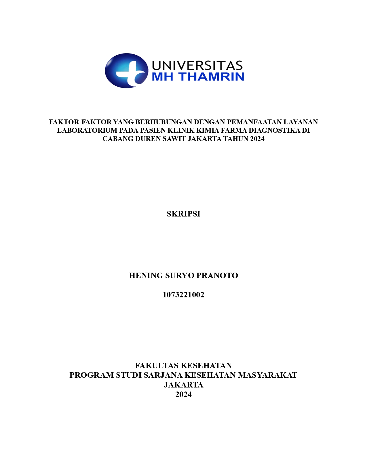 Hening Suryo, Pranoto (2024) FAKTOR-FAKTOR YANG BERHUBUNGAN DENGAN PEMANFAATAN LAYANAN LABORATORIUM PADA PASIEN KLINIK KIMIA FARMA DIAGNOSTIKA DI CABANG DUREN SAWIT JAKARTA TAHUN 2024. Other thesis, Universitas Mohammad Husni Thamrin.