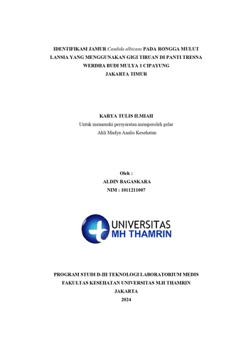 ALDIN, BAGASKARA (2024) IDENTIFIKASI JAMUR Candida albicans PADA RONGGGA MULUT LANSIA YANG MENNGUNAKAN GIGI TIRUAN DI PANTI TRESNA WERDHA BUDI MULYA 1 CIPAYUNG JAKARTA TIMUR. Diploma thesis, Universitas Mohammad Husni Thamrin.