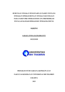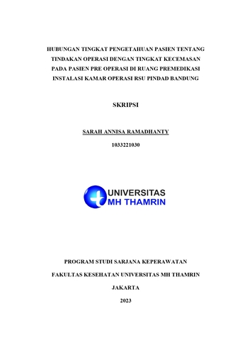 Sarah Annisa, Ramadhanty (2024) HUBUNGAN PENGETAHUAN PASIEN TENTANG TINDAKAN OPERASI DENGAN KECEMASAN PADA PASIEN PRE OPERASI DI RUANG PREMEDIKASI INSTALASI KAMAR OPERASI RSU PINDAD BANDUNG. Other thesis, Universitas Mohammad Husni Thamrin.