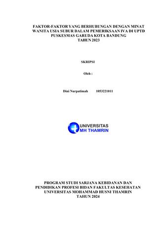 Dini, Nurpatimah (2024) FAKTOR-FAKTOR YANG BERHUBUNGAN DENGAN MINAT WANITA USIA SUBUR DALAM PEMERIKSAAN IVA DI UPTD PUSKESMAS GARUDA KOTA BANDUNG TAHUN 2023. Other thesis, Universitas Mohammad Husni Thamrin.